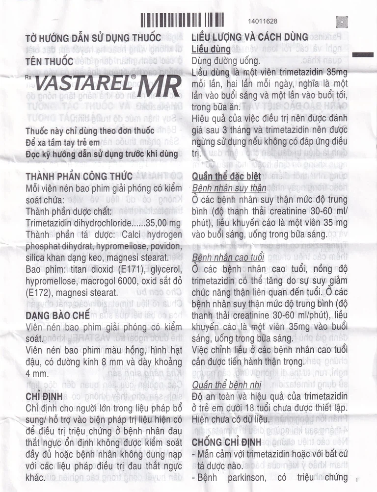 Thuốc Vastarel Mr được chỉ định cho người lớn trong liệu pháp bổ sung/ hỗ trợ vào biện pháp trị liệu hiện có để điều trị triệu chứng ở bệnh nhân đau thắt ngực ổn định không được kiểm soát đầy đủ hoặc bệnh nhân không dung nạp với các liệu pháp điều trị đau thắt ngực khác.