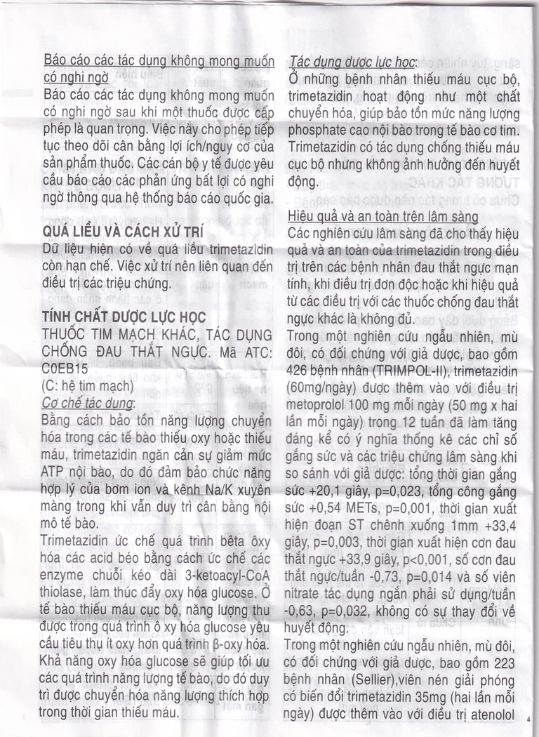Dữ liệu hiện có về quá liều trimetazidin quả và an toàn của trimetazidin trong điều còn hạn chế. Việc xử trí nên liên quan đến điều trị các triệu chứng.