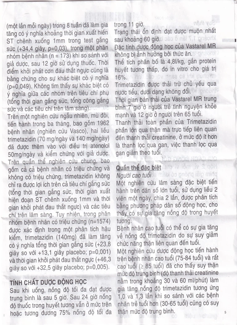 Thải trừ:Trimetazidin được thải trừ chủ yếu qua nước tiểu, dưới dạng không đối. Thời gian bán thải của Vastarel MR trung bình 7 giờ ở người trẻ tình nguyện khỏe mạnh và 12 giờ ở người trên 65 tuổi. Thanh thải toàn phần của trimetazidin phần lớn qua thận, trực tiếp liên quan đến thanh thải creatinin, ở mức độ ít hơn là thanh lọc qua gan, việc thanh lọc qua gan giảm theo tuổi.