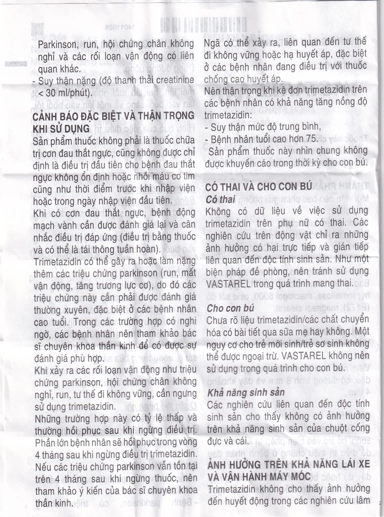 Chưa rõ liệu trimetazidin/ các chất chuyển hóa có bài tiết qua sữa mẹ hay không. Nguy cơ cho trẻ mới sinh/ trẻ sơ sinh không được loại trừ. Vì vậy, VASTAREL không nên sử dụng trong quá trình cho con bú.
