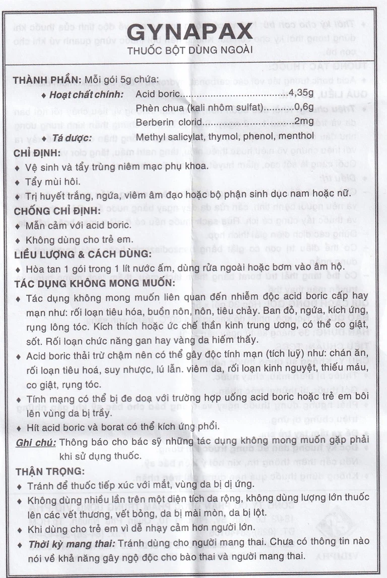 Thành phần của Thuốc vệ sinh phụ nữ Gynapax