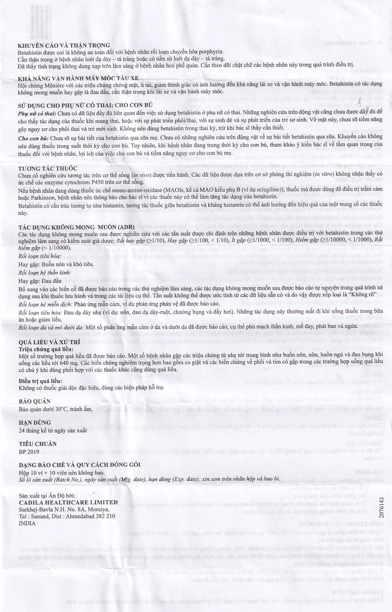 - Betahistin có tác dụng không mong muốn hay gặp là đau đầu, cần thận trọng khi lái xe và vận hành máy móc.