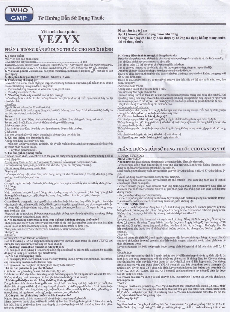 Vezyx của Công ty cổ phần dược phẩm Đạt Vi Phú (Davipharm), thành phần chính là Levocetirizin dihydroclorid. Vezyx là thuốc làm giảm triệu chứng ở mũi và mắt trong bệnh viêm mũi dị ứng theo mùa và viêm mũi dị ứng kinh niên; làm giảm triệu chứng mày đay mạn tính vô căn. Vezyx được bào chế dưới dạng viên nén dài, bao phim màu trắng, một mặt có dập logo, mặt kia có dập gạch ngang, đóng gói theo quy cách hộp 2 vỉ (Nhôm-Nhôm) x 14 viên.