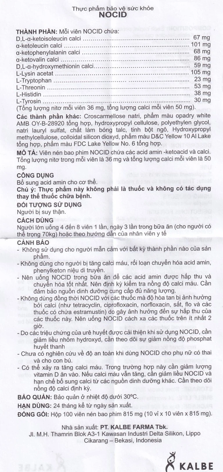 Viên nén bao phim Nocidchứa các acid amin-ketoacid và calci. Tổng lượng nitơ trong mỗi viên là 36mg và tổng lượng calci mỗi viên là 50mg. Viên nén Nocid giúp bổ sung nhu cầu axit amin cho cơ thể, được sử dụng cho các bệnh nhân suy thận nhằm ức chế sự tiến triển của giai đoạn thẩm phân.