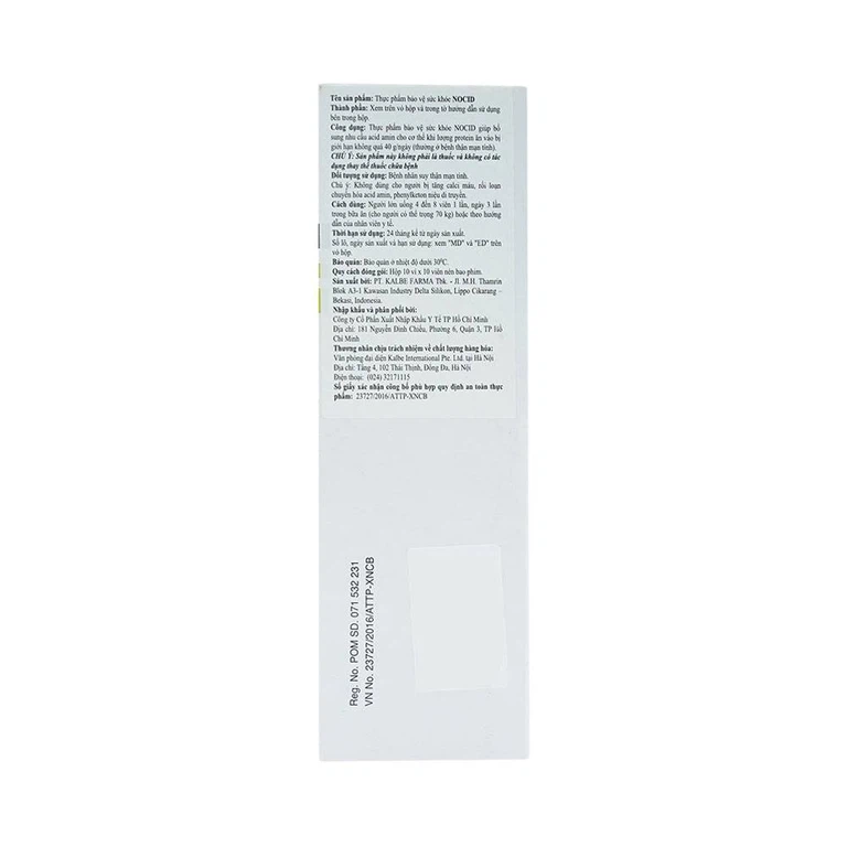 Viên nén Nocid có chứa các axit amin giúp bù đắp lượng protein mà cơ thể còn thiếu, ngăn chặn tổn thương thận đồng thời chống suy dinh dưỡng ở người bệnh suy thận.