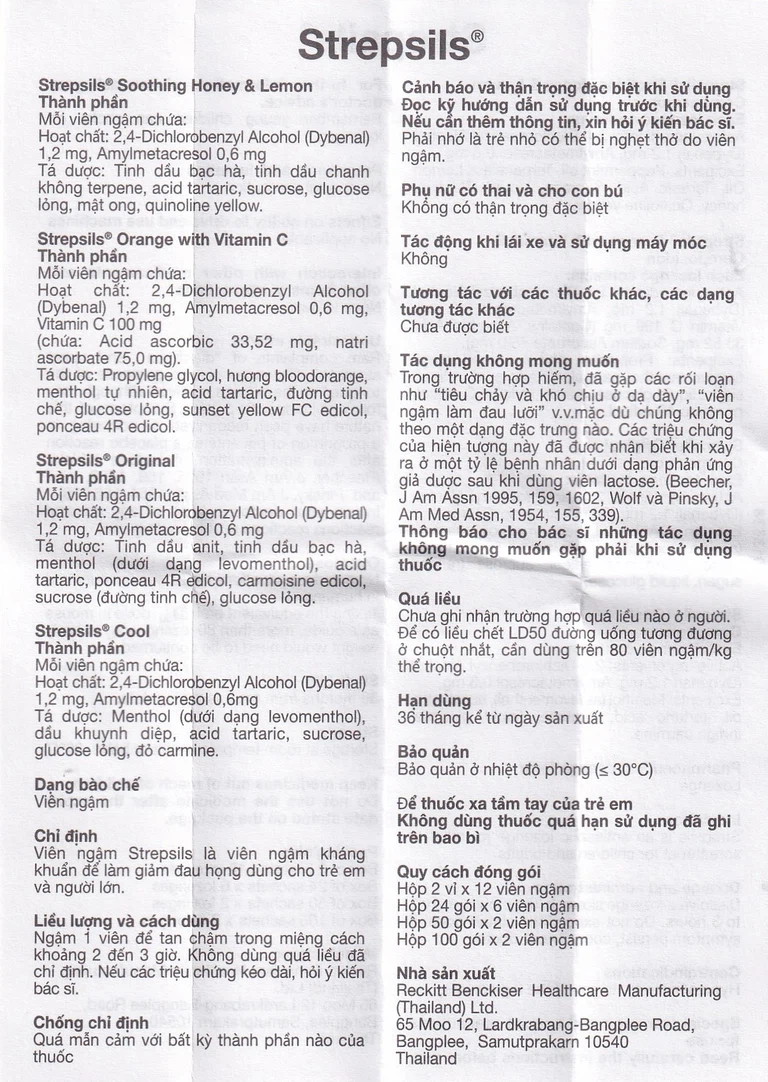 - Strepsils Soothing Honey và Lemon là viên ngậm chứa hai hoạt chất 2,4-dichlorobenzyl alcohol (dybenal) và amylmetacresol có tính kháng khuẩn sử dụng trong điều trị viêm họng.