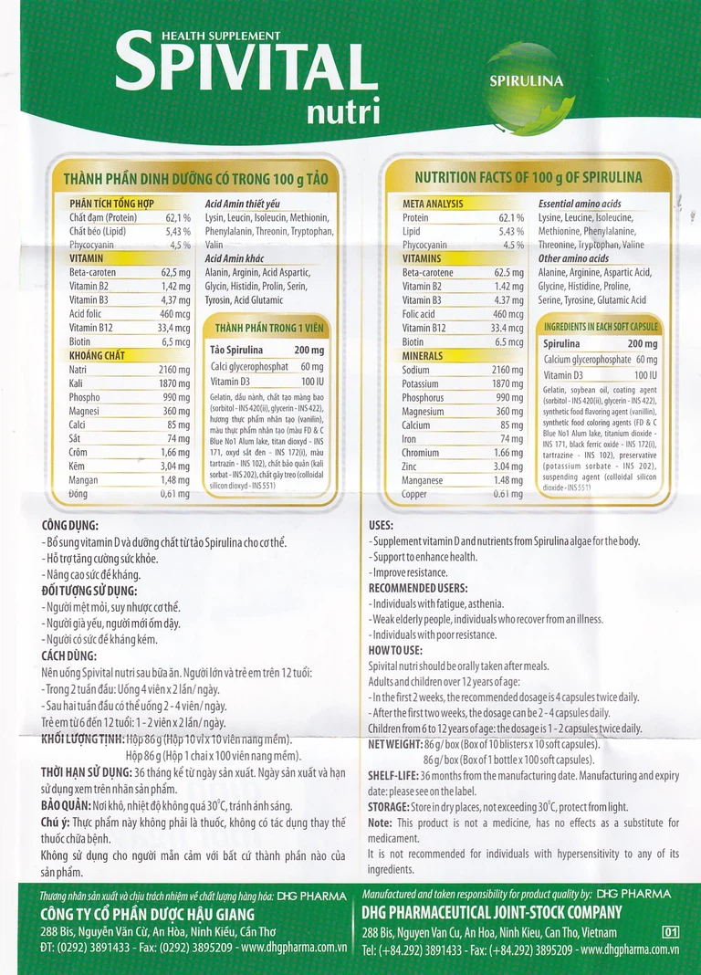 Viên Tảo Spivital Nutrilà sản phẩm của Công ty Dược Hậu Giang (DHG Pharma) . Đặt ra sứ mệnh cung cấp sản phẩm và dịch vụ chất lượng cao, thỏa mãn ước vọng vì một cuộc sống khỏe đẹp hơn, DHG Pharma luôn lấy chất lượng, an toàn hiệu quả làm cam kết cao nhất.