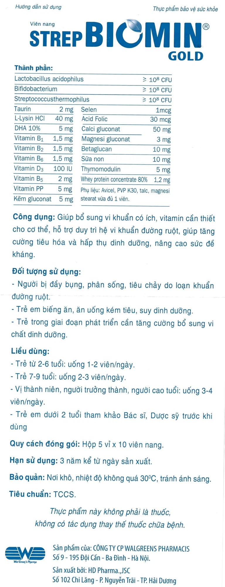 Viên uống Strep Biomin Gold được bổ sung Lactobacillus acidophilus có lợi trong hệ tiêu hóa để tiêu hóa thức ăn và hấp thụ chất dinh dưỡng tốt hơn. Ngoài ra, các vi khuẩn còn có tác dụng hỗ trợ điều trị bệnh tiêu chảy, bao gồm các bệnh tiêu chảy do nhiễm trùng đường tiêu hóa hay do sử dụng thuốc kháng sinh thường gặp ở trẻ.