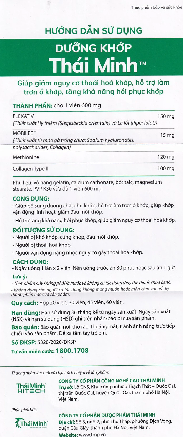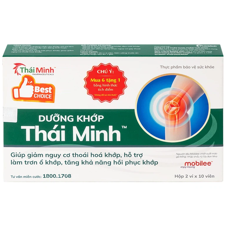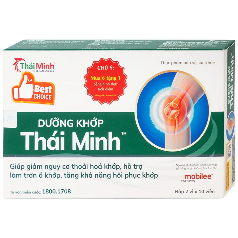 Dưỡng Khớp Thái Minh với các thành phần flexativ, methionin, mobilee, collagen type II giúp duy trì, cải thiện sức mạnh của xương và tính linh hoạt cho khớp.