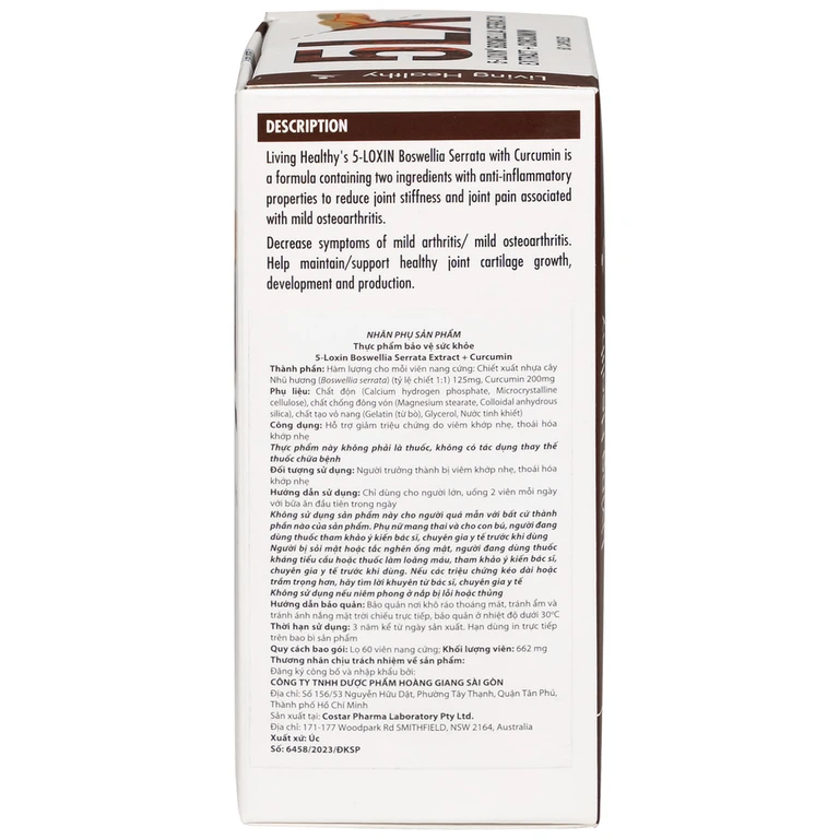 Living Healthy 5-Loxin Boswellia Serrata Extract + Curcumin hỗ trợ giảm triệu chứng do viêm khớp nhẹ, thoái hóa khớp nhẹ.