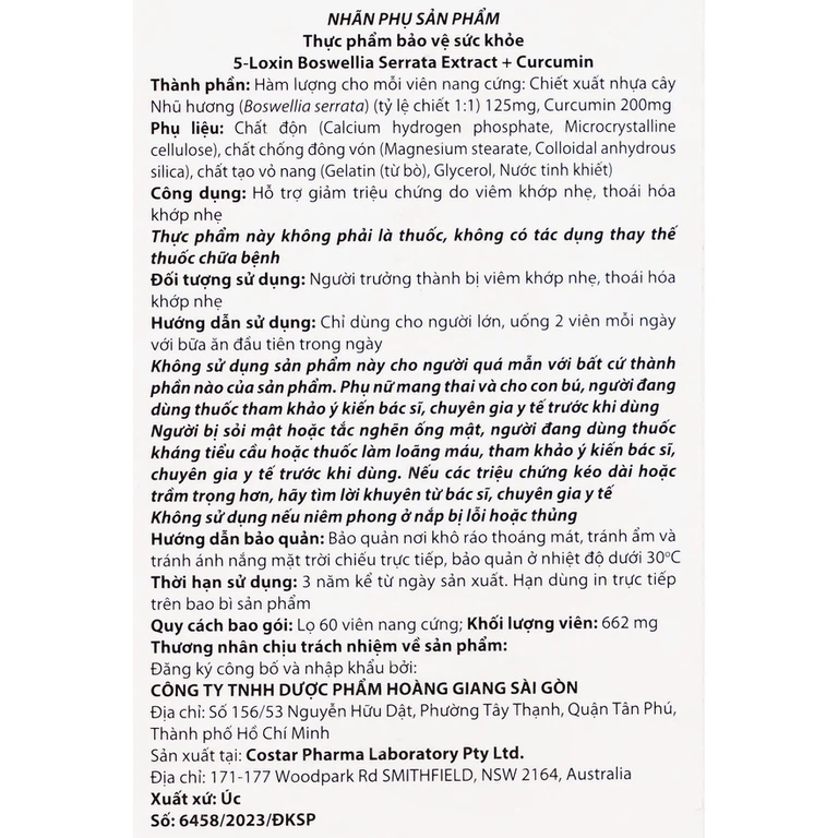 Thành phần của Living Healthy 5-Loxin Boswellia Serrata Extract + Curcumin