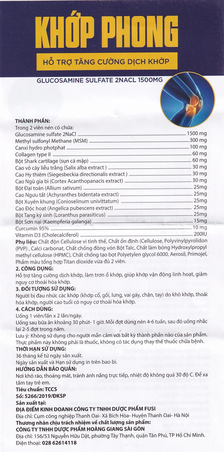 Viên uống Khớp Phong ngoài Glucosamine và các hoạt chất tốt cho xương khớp được khoa học hiện đại chứng minh còn chứa các thành phần thảo dược tốt cho sức khỏe xương khớp như cao vỏ cây liễu trắng , cao hy thiêm , ngũ gia bì, tang ký sinh, độc hoạt sẽ hỗ trợ giúp người bệnh giảm các cơn đau nhức khớp, đồng thời hỗ trợ giảm nguy cơ thoái hóa khớp hiệu quả.