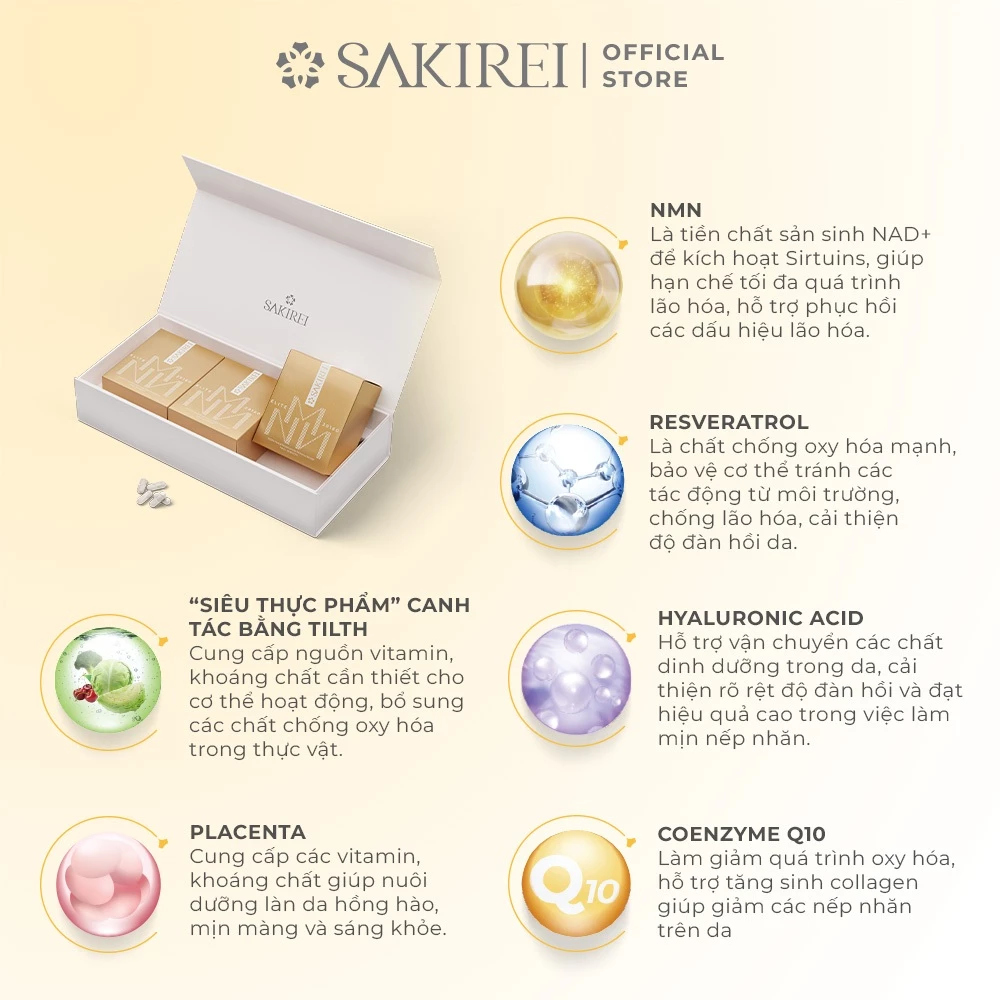 Sakirei là thương hiệu đến từ Nhật Bản, chuyên cung cấp các giải pháp hỗ trợ sức khỏe và sắc đẹp từ bên trong. Các sản phẩm của Sakirei nổi bật nhờ việc kết hợp các thành phần khoa học tiên tiến (như NMN) với nguồn nguyên liệu tự nhiên, tinh khiết, được canh tác theo các phương pháp đặc biệt.