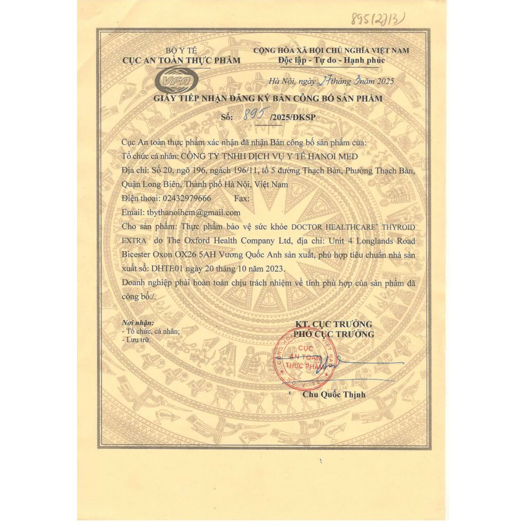 Với nguồn gốc xuất xứ rõ ràng và đã được cấp số đăng ký tại Việt Nam (458/2025/ĐKSP), Thyroid Extra là giải pháp đáng tin cậy cho những người cần chăm sóc tuyến giáp và phòng ngừa các vấn đề do thiếu hụt I-ốt.