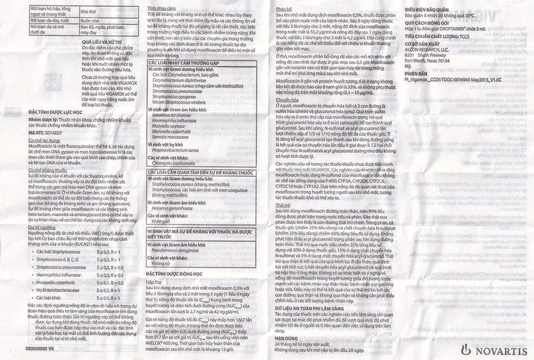 Sau khi dùng dung dịch nhỏ mắt moxifloxacin 0,5% với liều 3 lần/ngày cho cả 2 mắt trong 5 ngày (1 liều ở ngày thứ 5), nồng độ thuốc tối đa (Cmax) trung bình trong huyết tương và diện tích dưới đường cong (AUC 0 – ∞) của moxifloxacin lần lượt là 2,7 ng/ml và 42 ng.giờ/ml.