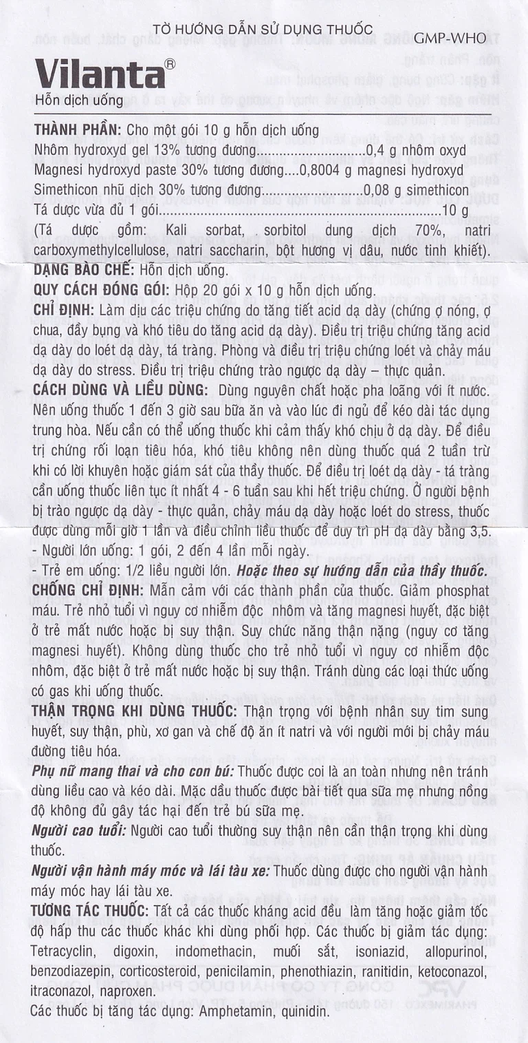 Vilanta là hỗn hợp của nhôm hydroxide, magnesi hydroxide và simethicone.