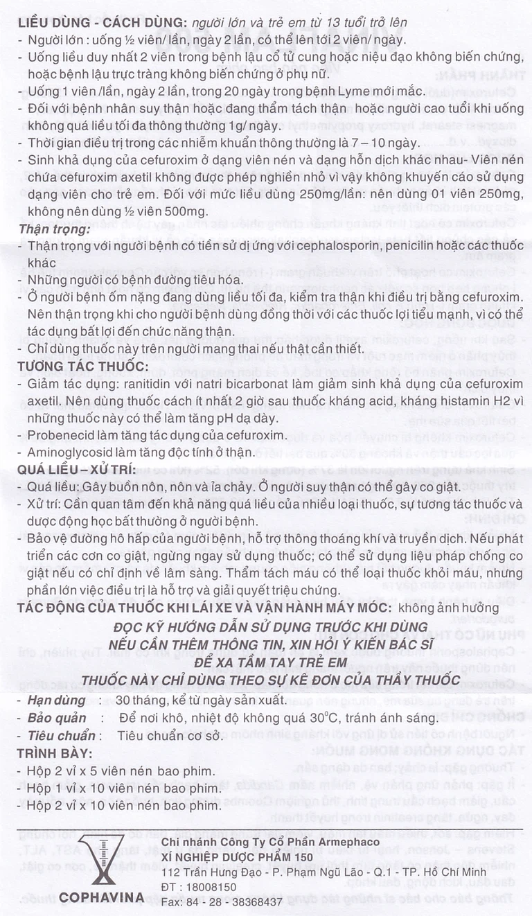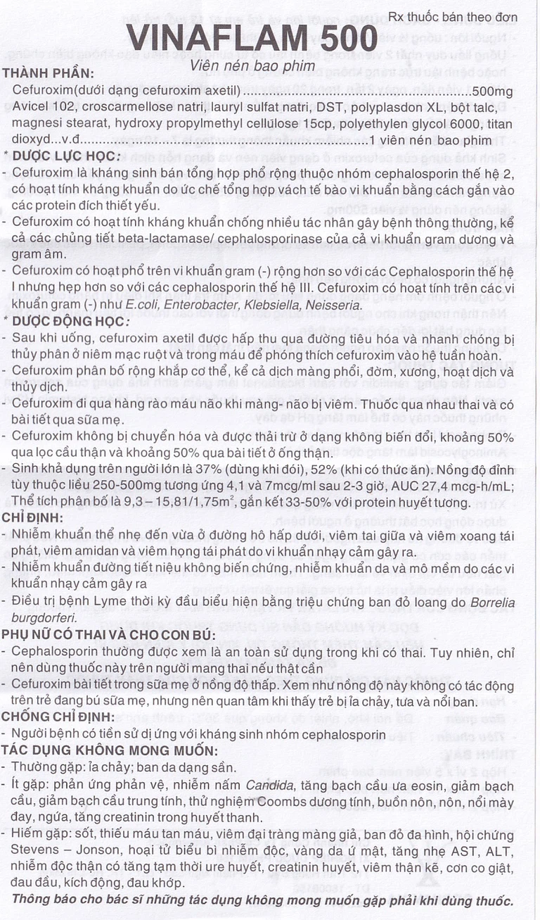 Vinaflam 500 của công ty cổ phần Armephaco, thành phần chính cefuroxim, là thuốc dùng để điều trị nhiễm khuẩn thể nhẹ đến vừa ở đường hô hấp dưới, viêm tai giữa và viêm xoang tái phát, viêm amidan và viêm họng tái phát do vi khuẩn nhạy cảm gây ra, nhiễm khuẩn đường tiết niệu không biến chứng, nhiễm khuẩn da và mô mềm do các vi khuẩn nhạy cảm gây ra, điều trị bệnh Lyme thời kỳ đầu biểu hiện bằng triệu chứng ban đỏ loang do Borrelia burgdorferi. Thuốc được đóng gói dưới dạng hộp 2 vỉ x 5 viên nén bao phim, hộp 1 vỉ x 10 viên nén bao phim, hộp 2 vỉ x 10 viên nén bao phim.
