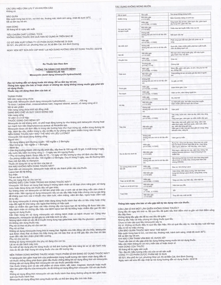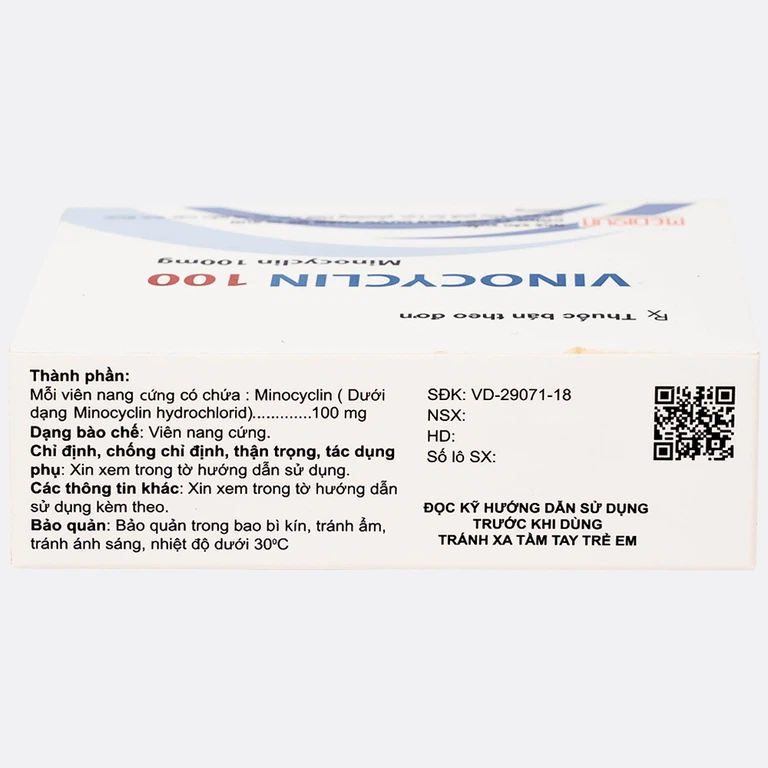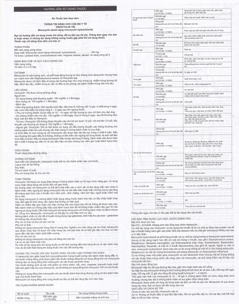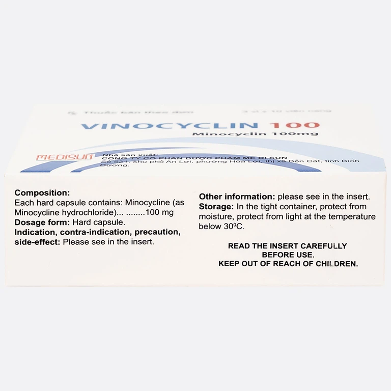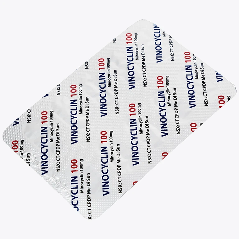 Thuốc Vinocyclin 100 là sản phẩm của Công ty Cổ phần Dược phẩm Medisun chứa hoạt chất Minocyclin là một kháng sinh, có phổ hoạt động tương tự như kháng sinh tetracyclin nhưng hoạt lực mạnh hơn trên Staphylococcus aureus và Nocardia spp.Minocyclin được chỉ định điều trị trong các trường hợp như mụn trứng cá, nhiễm trùng đường hô hấp, bệnh lậu cầu, nhiễm trùng tụ cầu và điều trị dự phòng các bệnh nhiễm trùng não mô cầu.