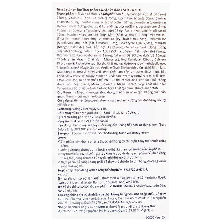 Viên uống Liveril Vitabiotics hỗ trợ tăng cường chức năng gan, tăng cường đề kháng (5 vỉ x 6 viên)