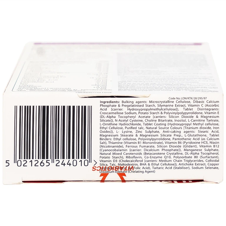 Silymarin, Vitamin C, L-carnitine tartrate, Choline bitartrate, Inositol, N-acetyl Cysteine, L-Ornithine, chiết xuất atiso, L-Lysine, L-Glutathione, Vitamin E, Pantothenic acid, Niacin, Kẽm, Vitamin B1, Vitamin B6, Vitamin B2, Sắt, Co-enzyme Q10, Mangan, Hỗn hợp Carotenoids tự nhiên, Đồng, Folacin, Selen, Vitamin B12, Vitamin D3