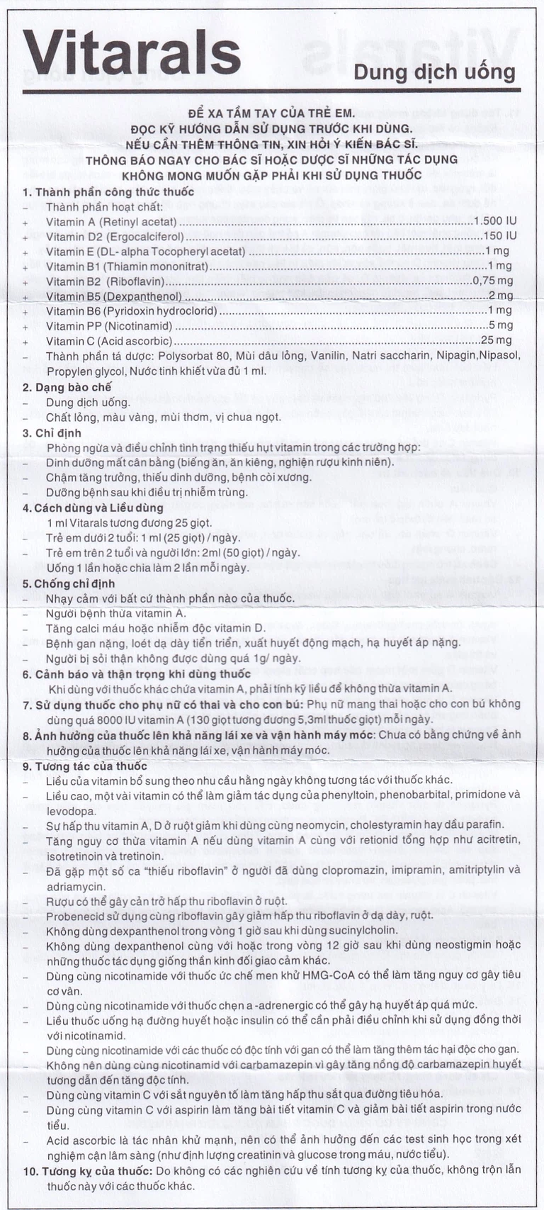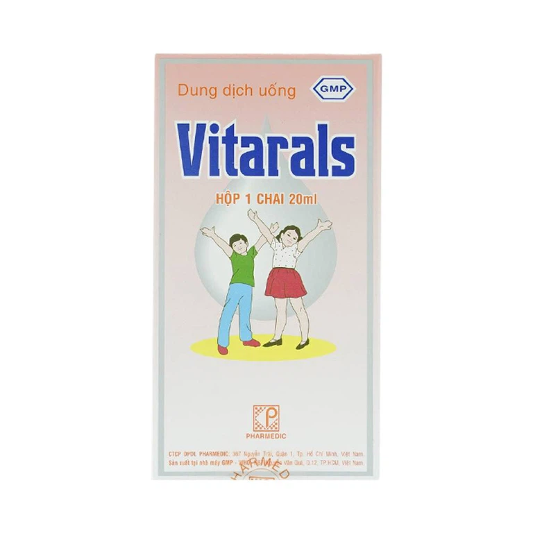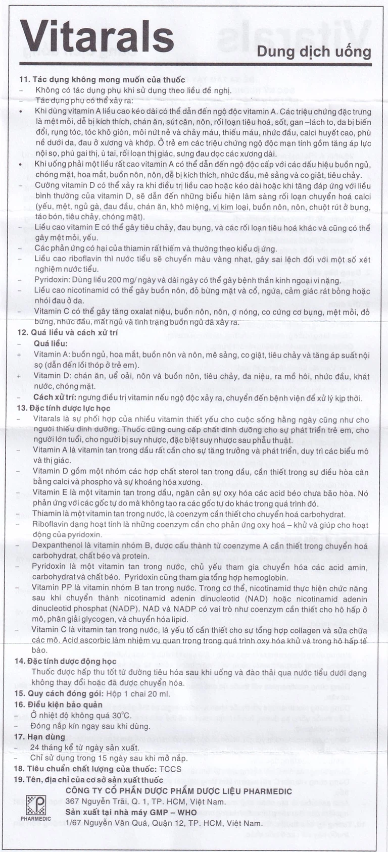 Vitarals là sản phẩm của Công ty cổ phần dược phẩm dược liệu Pharmedic, thành phần chính bao gồm vitamin A, vitamin D2, vitamin E, vitamin B1, vitamin B2, vitamin B5, vitamin B6, vitamin PP và vitamin C. Thuốc dùng để phòng ngừa và điều chỉnh tình trạng thiếu hụt vitamin trong một số trường hợp. Vitarals được bào chế dạng dung dịch uống, màu vàng, có mùi thơm, vị chua ngọt; đóng gói theo quy cách: hộp 1 chai 20 ml.