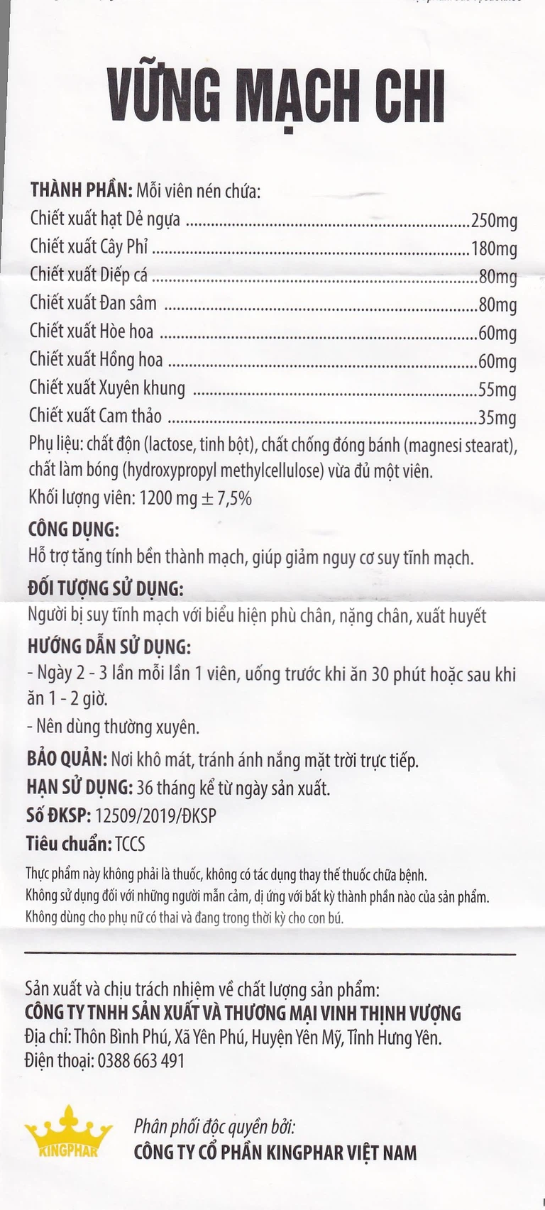 Viên uống Vững Mạch Chi Kingphar hỗ trợ tăng tính bền thành mạch, giảm nguy cơ suy tĩnh mạch (6 vỉ x 10 viên)
