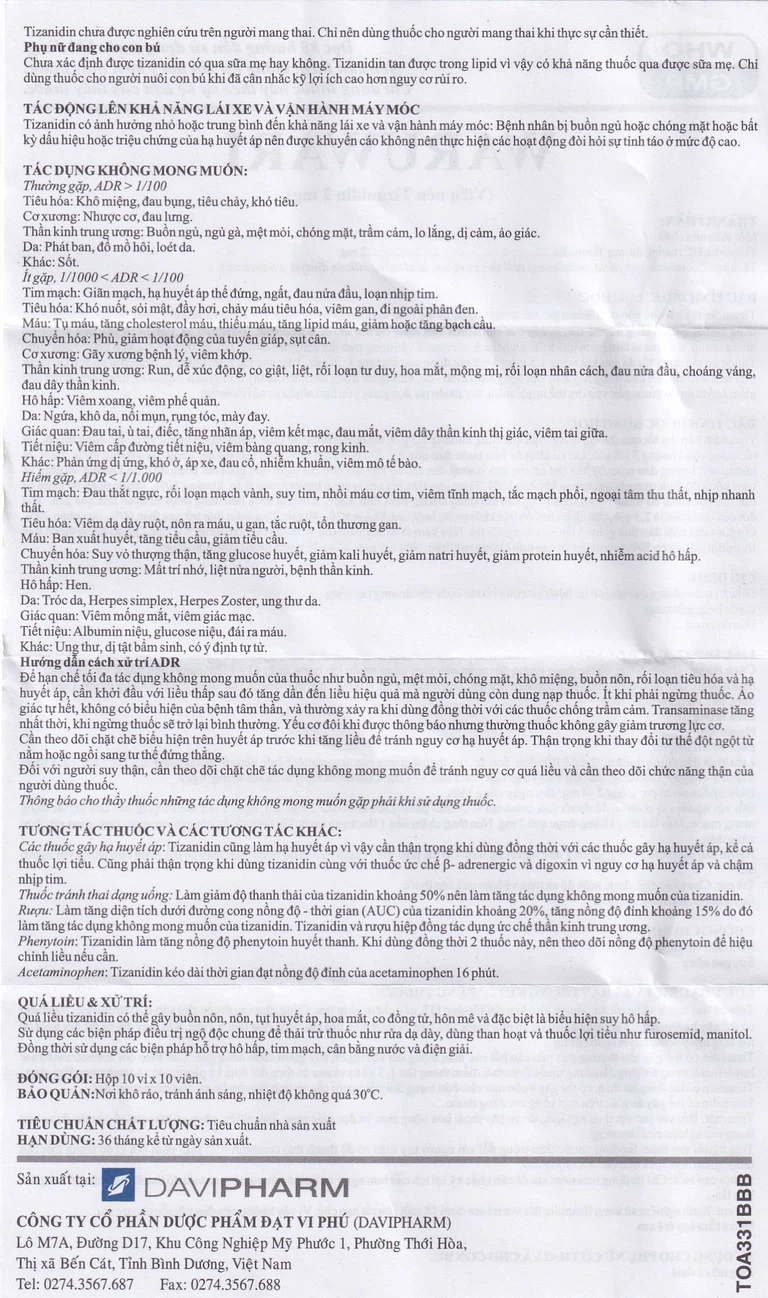 Các thuốc gây hạ huyết áp: Tizanidin cũng làm hạ huyết áp vì vậy cần thận trọng khi dùng đồng thời với các thuốc gây hạ huyết áp, kể cả thuốc lợi tiểu. Cũng phải thận trọng khi dùng tizanidin cùng với thuốc ức chế β – adrenergic và digoxin vì nguy cơ hạ huyết áp và chậm nhịp tim.