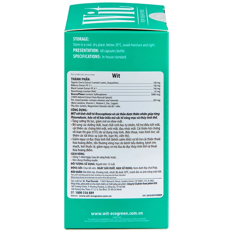 Witđược nghiên cứu và sản xuất tại Mỹ từ nhà sản xuấtSt. Paul Brands, nhập khẩu và phân phối bởiDược phẩm Eco (Ecogreen). Thương hiệu Eco luôn cam kết mang đến cho người tiêu dùng sản phẩm có chất lượng tốt, an toàn, hiệu quả cải thiện cao, dịch vụ chuyên nghiệp với giá thành hợp lý.