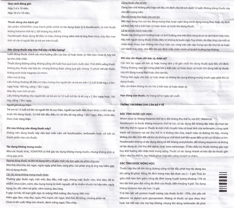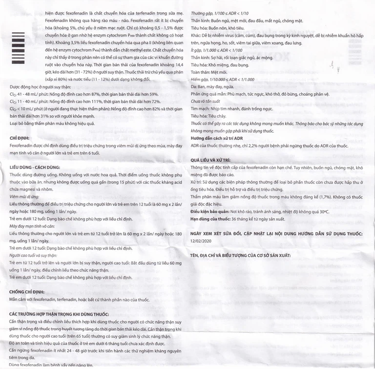 Liều thông thường để điều trị triệu chứng cho người lớn và trẻ em trên 12 tuổi là 60 mg x 2 lần/ngày hoặc 180 mg, uống 1 lần/ngày.