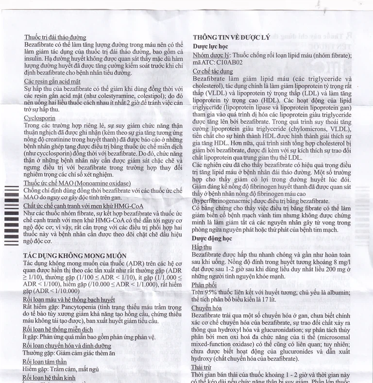 Bezafibrat ức chế sinh tổng hợp cholesterol ở gan, tác dụng chính là làm giảm lipoprotein tỷ trọng rất thấp và lipoprotein tỷ trọng thấp (VLDL và LDL) và làm tăng lipoprotein tỷ trọng cao (HDL). Do đó, thuốc cải thiện một cách đáng kể phân bố cholesterol trong huyết tương. Bezafibrat có khả năng làm hạ cholesterol máu và triglycerid máu nên được dùng để điều trị tăng lipid máu typ la, IIb, HI, IV và V kèm theo chế độ ăn rất hạn chế mỡ.