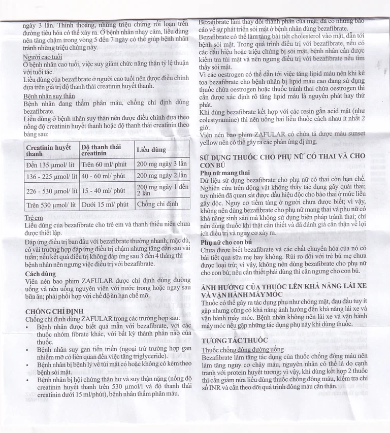 Chống chỉ định dùng bezafibrat ở bệnh nhân đang thẩm phân máu. Liều dùng ở bệnh nhân suy thận nên được điều chỉnh dựa theo nồng độ creatinin huyết thanh hoặc độ thanh thải creatinin.