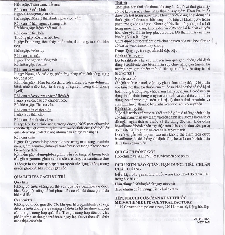 Không có triệu chứng cụ thể của quá liều bezafibarate được biết. Suy thận nặng có hồi phục, tiêu cơ vân đã được ghi nhận khi quá liều.