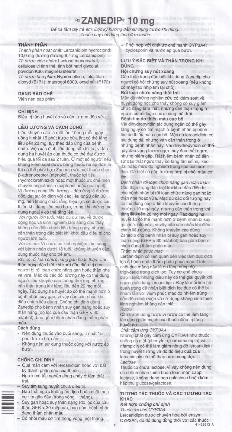 Mỗi viên Zanedip 10 mg có chứa 30 mg lactose, vì vậy không nên dùng cho bệnh nhân thiếu men lapp lactase, galactose máu hoặc hội chứng kém hấp thu glucose/galactose.