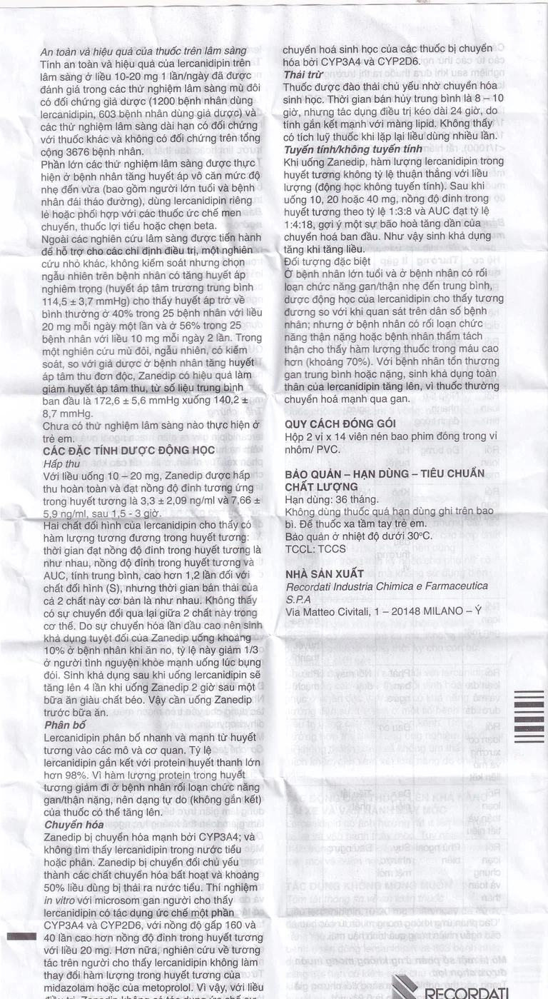 Hai chất đối hình của lercanidipin cho thấy có hàm lượng tương đương trong huyết tương: Thời gian đạt nồng độ đỉnh trong huyết tương là như nhau, nồng độ đỉnh trong huyết tương và AUC, tính trung bình, cao hơn 1,2 lần đối với chất đối hình (S), nhưng thời gian bán thải của cả 2 chất này cơ bản là như nhau. Không thấy có sự chuyển đổi qua lại giữa 2 chất này trong cơ thể. Do sự chuyển hóa lần đầu cao nên sinh khả dụng tuyệt đối của Zanedip uống khoảng 10% ở bệnh nhân khi ăn no, tỷ lệ này giảm 1/3 ở người tình nguyện khỏe mạnh uống lúc bụng đói. Sinh khả dụng sau khi uống lercanidipin sẽ tăng lên 4 lần khi uống Zanedip 2 giờ sau một bữa ăn giàu chất béo. Vậy cần uống Zanedip trước bữa ăn.
