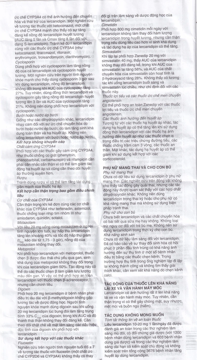 Zanedip bị chuyển hóa mạnh bởi CYP3A4 và không tìm thấy lercanidipin trong nước tiểu hoặc phân. Zanedip bị chuyển đổi chủ yếu thành các chất chuyển hóa bất hoạt và khoảng 50% liều dùng bị thải ra nước tiểu. Thí nghiệm in vitro với microsom gan người cho thấy lercanidipin có tác dụng ức chế một phần CYP3A4 và CYP2D6, với nồng độ gấp 160 và 40 lần cao hơn nồng độ đỉnh trong huyết tương với liều 20 mg. Hơn nữa, nghiên cứu về tương tác trên người cho thấy lercanidipin không làm thay đổi hàm lượng trong huyết tương của midazolam hoặc của metoprolol. Vì vậy, với liều điều trị, Zanedip không có tác dụng ức chế sự chuyển hoá sinh học của các thuốc bị chuyển hóa bởi CYP3A4 và CYP2D6.