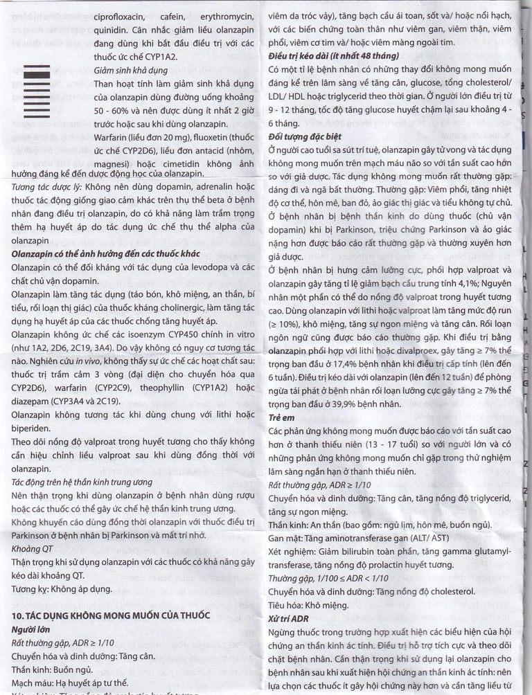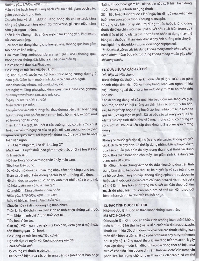 Phản ứng dị ứng thuốc kèm tăng bạch cầu ái toan và những triệu chứng toàn thân (DRESS): DRESS đã được báo cáo khi sử dụng olanzapin. DRESS có thể biểu hiện qua các phản ứng trên da (như phát ban hoặc viêm da tróc vảy), tăng bạch cầu ái toan, sốt và/ hoặc nổi hạch, với các biến chứng toàn thân như viêm gan, viêm thận, viêm phổi, viêm cơ tim và/hoặc viêm màng ngoài tim. DRESS đôi khi gây tử vong. Ngừng olanzapin nếu nghi ngờ bệnh nhân bị DRESS.