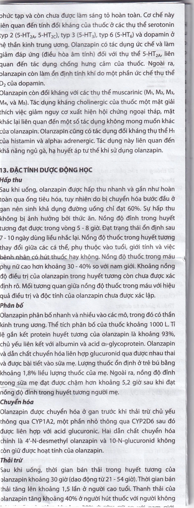 Trẻ em: Thanh thiếu niên (từ 13 – 17 tuổi): Dược động học của olanzapin ở thanh thiếu niên tương tự như người lớn. Trong nghiên cứu lâm sàng, AUC trung bình olanzapin ở thanh thiếu niên cao hơn khoảng 27%.
