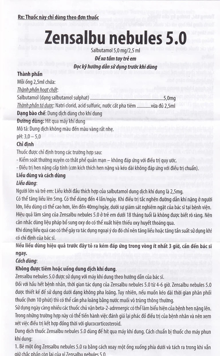 - Co thắt phế quản nghịch lý, có thể xuất hiện với việc tăng tức thì triệu chứng khò khè sau khi dùng thuốc. Nên được điều trị ngay bằng dạng thuốc khác hoặc hít thuốc giãn phế quản tác dụng nhanh khác. Ngừng sử dụng Zensalbu nebules 5.0 ngay, đánh giá bệnh nhân và thay thế bằng phương pháp điều trị khác nếu cần thiết.