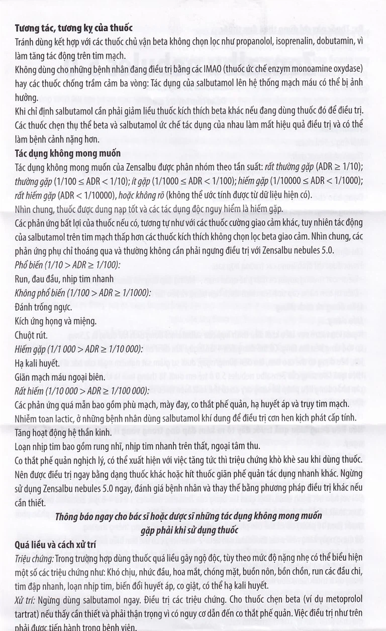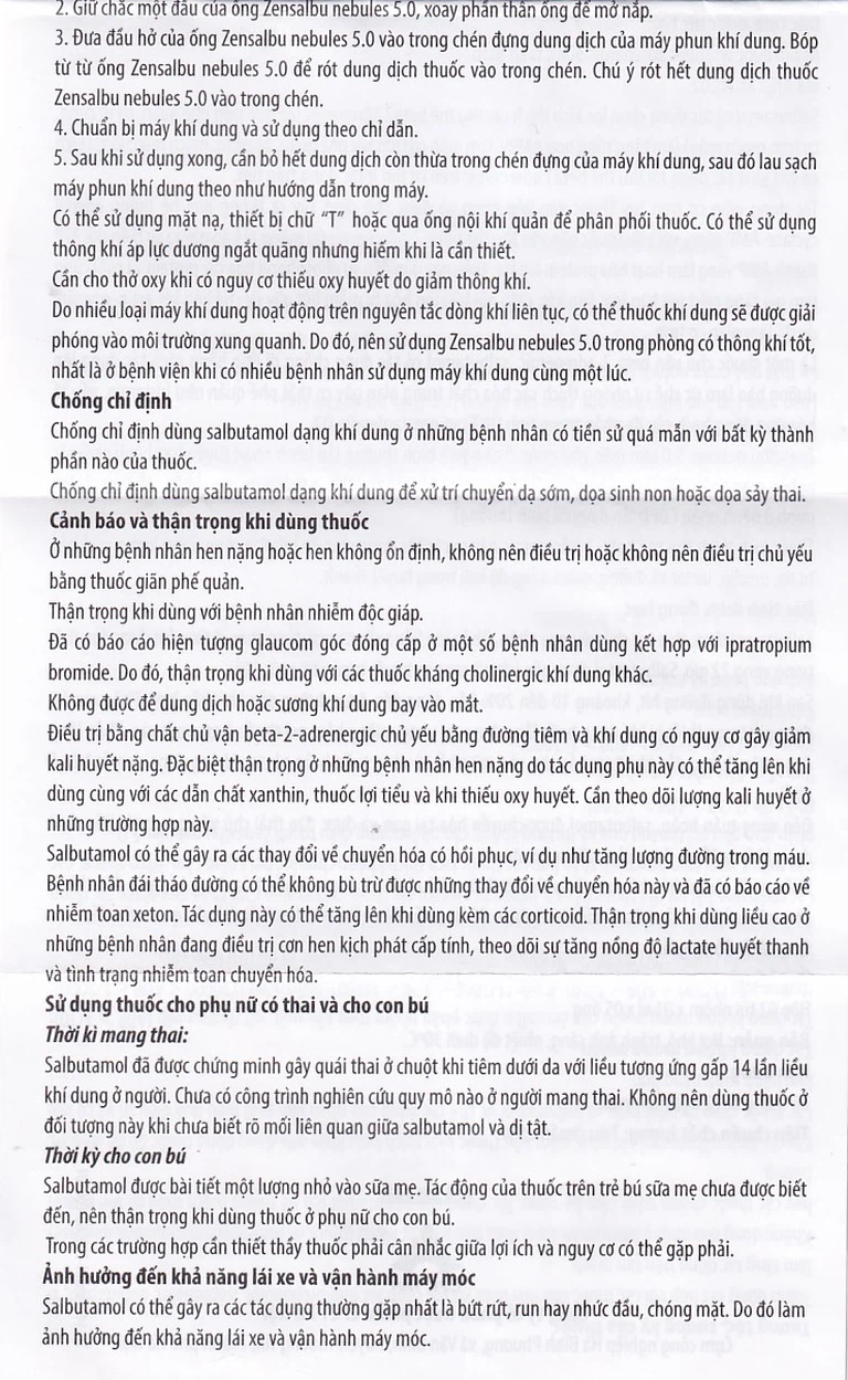 Các phản ứng bất lợi của thuốc nếu có, tương tự như với các thuốc cường giao cảm khác, tuy nhiên tác động của salbutamol trên tim mạch thấp hơn các thuốc kích thích không chọn lọc beta giao cảm. Nhìn chung, các phản ứng phụ chỉ thoáng qua và thường không cần phải ngưng điều trị với Zensalbu nebules 5.0.