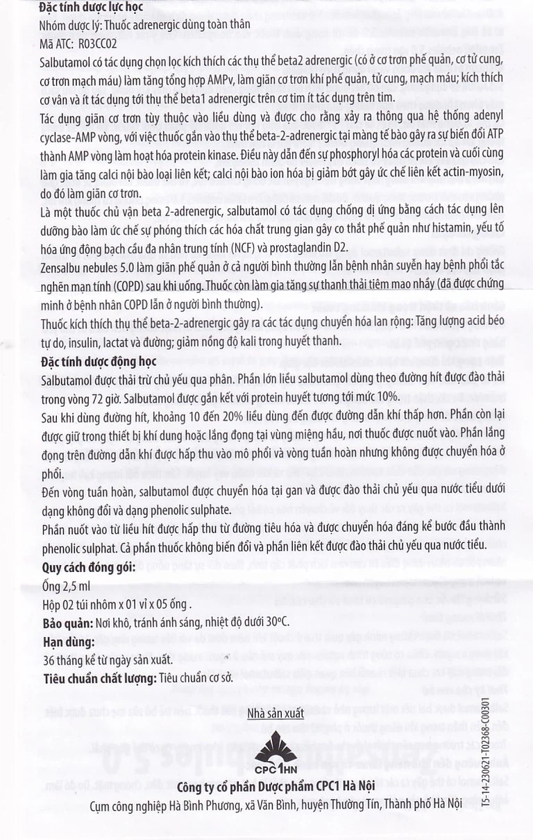 Zensalbu nebules 5.0 làm giãn phế quản ở cả người bình thường lẫn bệnh nhân suyễn hay bệnh phổi tắc nghẽn mạn tính (COPD) sau khi uống. Thuốc còn làm gia tăng sự thanh thải tiêm mao nhầy (đã được chứng minh ở bệnh nhân COPD lẫn ở người bình thường).