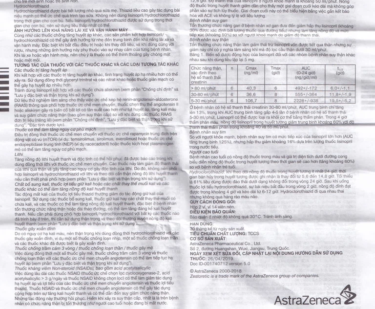 - Lisinopri/ hydrochlorothiazid không nên dùng cho các bệnh nhân suy thận (độ thanh thải creatinin < 80 mL/phút) trừ khi việc điều chỉnh liều của từng thành phần riêng của thuốc cho thấy sự cần dùng viên phối hợp.