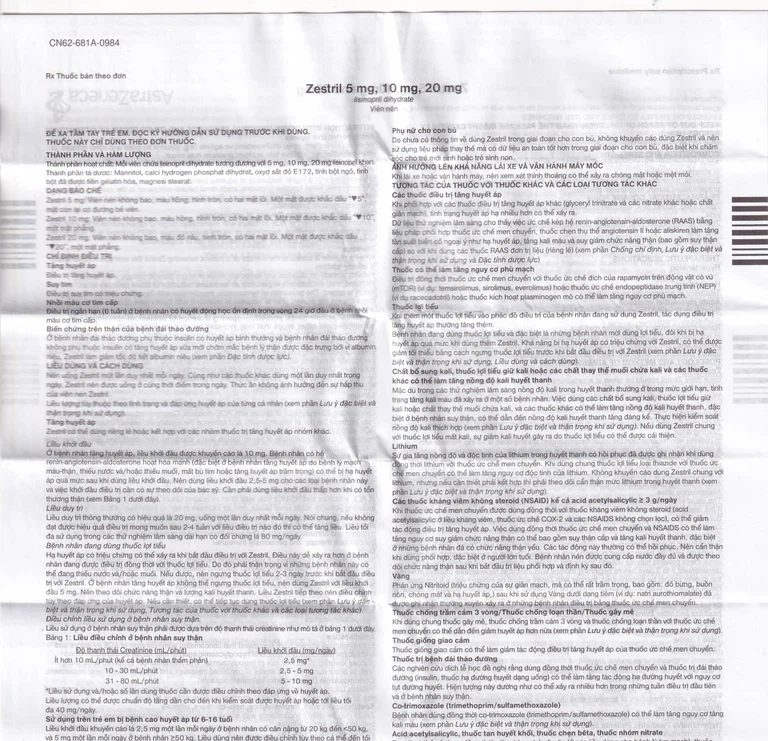 Bệnh nhân suy thận (độ thanh thải creatinin < 80 ml/phút), liều khởi đầu Zestril nên được điều chỉnh theo thông số này.