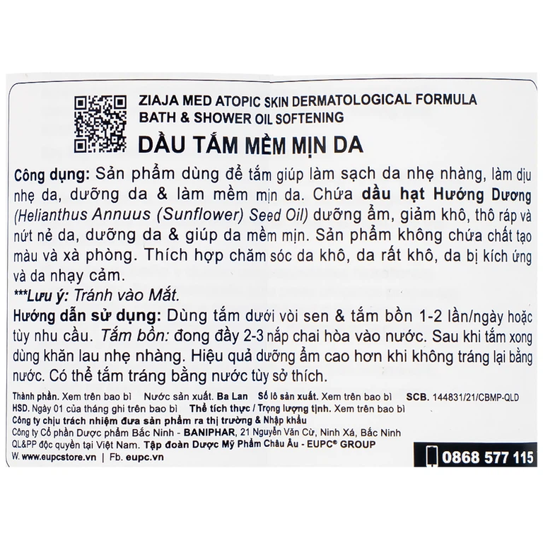 Sản phẩm dùng để tắm giúp làm sạch da nhẹ nhàng, làm dịu nhẹ da, dưỡng da và làm mềm mịn da. Chứa dầu hạt Hướng Dương (Helianthus Annuus (Sunflower) Seed Oil) dưỡng ẩm, giảm khô, thô ráp và nứt nẻ da, dưỡng da và giúp da mềm mịn. Sản phẩm không chứa chất tạo màu và xà phòng. Thích hợp chăm sóc da khô, da rất khô, da bị kích ứng và da nhạy cảm, da rất khô.
