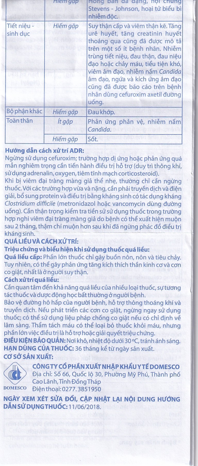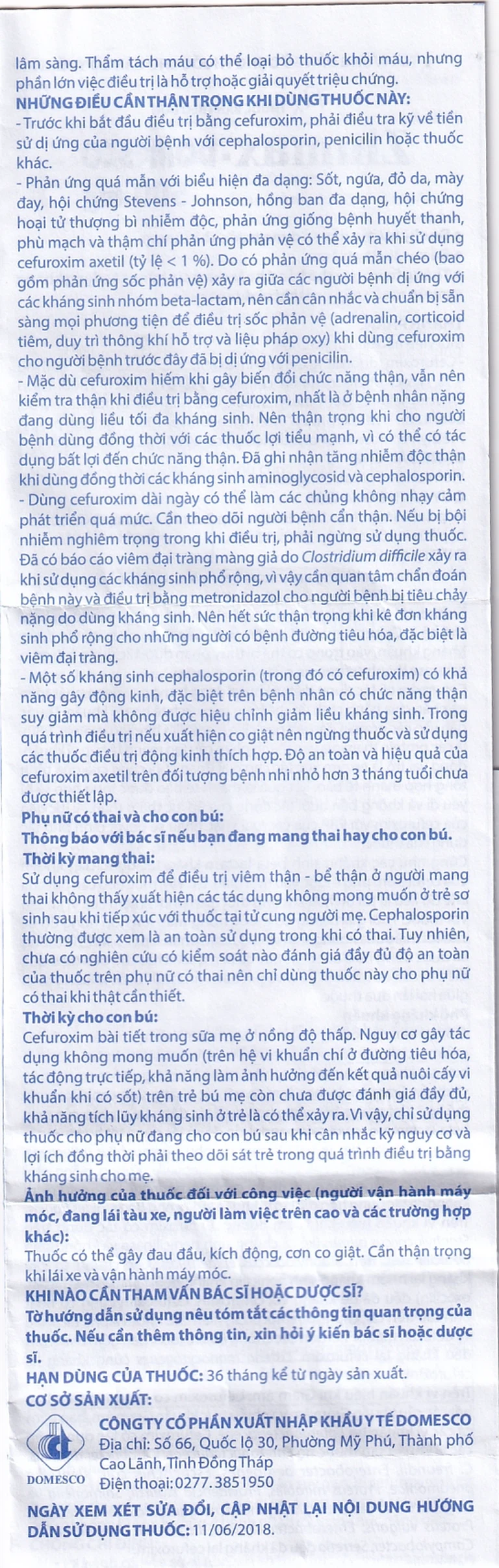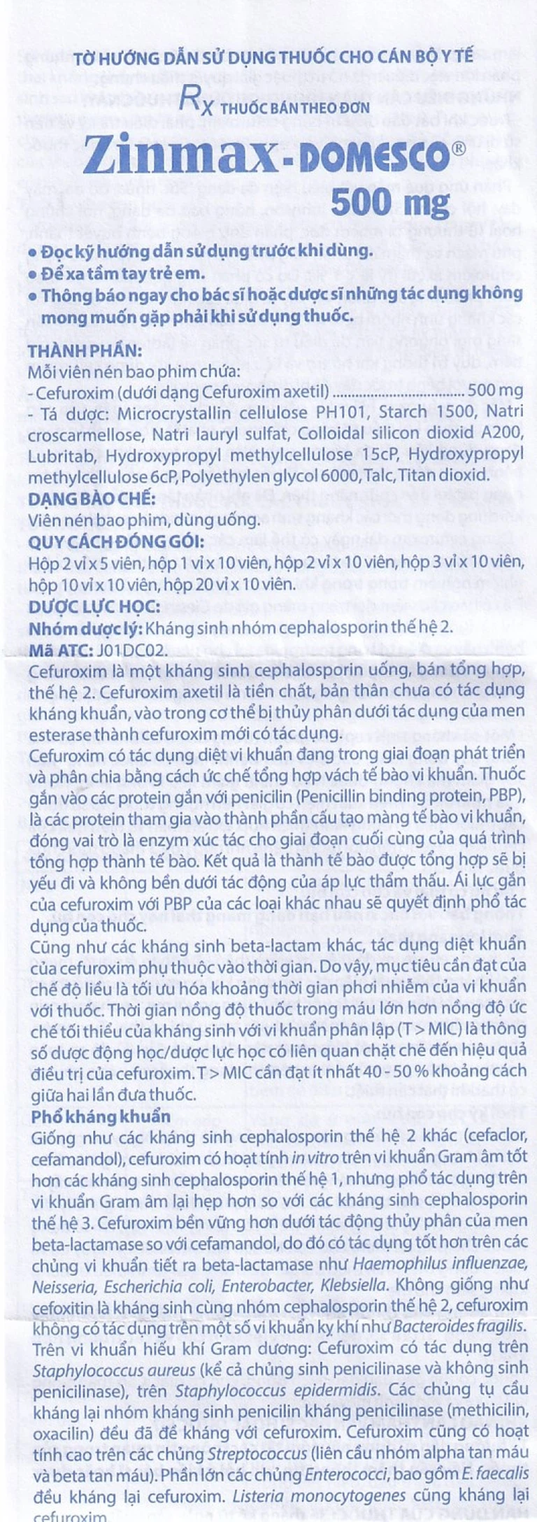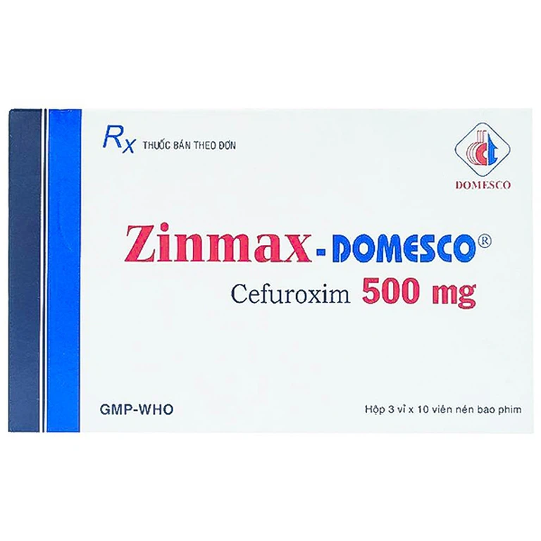 Zinmax Domesco 500mg có thành phần chính là Cefuroxime axetil có tác dụng điều trị nhiễm khuẩn đường hô hấp dưới, viêm tai giữa, viêm xoang, viêm amidan, viêm thanh quản, viêm họng. Nhiễm khuẩn đường tiết niệu không biến chứng, nhiễm khuẩn da và mô mềm. Điều trị bệnh Lyme thời kỳ đầu biểu hiện bằng triệu chứng ban đỏ loang Borrelia Burgdorferi. Viên nén bao phim, hình chữ nhật thuôn, màu trắng, hai mặt lồi, một mặt viên có khắc số 4618, cạnh và thành viên lành lặn. Nhân thuốc bên trong màu trắng ngà.