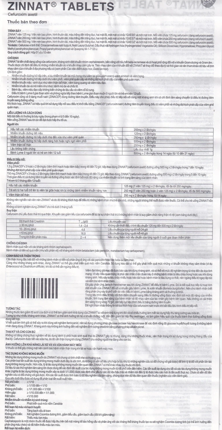 Sau khi uống viên nén Zinnat nồng độ đỉnh trong huyết thanh 7,0 mg/l đối với liều 500mg, xuất hiện sau khoảng 2-3 giờ sau khi thuốc được uống với thức ăn.