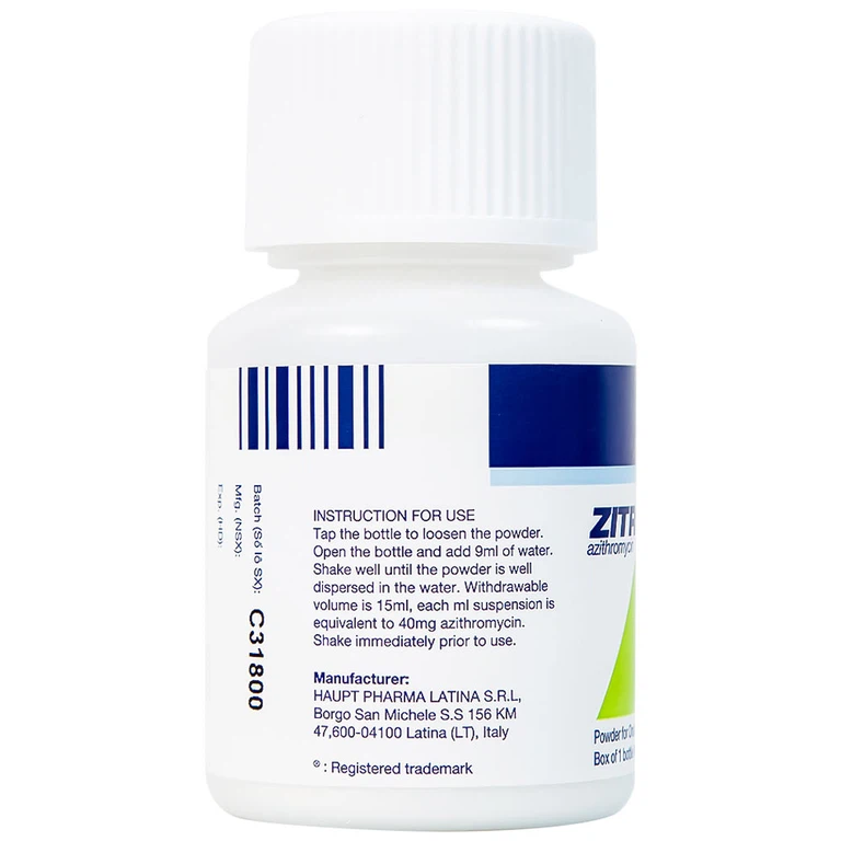 Bột pha hỗn dịch uống Zitromax là sản phẩm do Haupt Pharma Latina Srl sản xuất, với thành phần chính là Azithromycin, được dùng để điều trị những nhiễm khuẩn gây ra do vi khuẩn nhạy cảm như nhiễm khuẩn đường hô hấp trên và dưới, nhiễm khuẩn răng miệng, nhiễm khuẩn da và mô mềm…