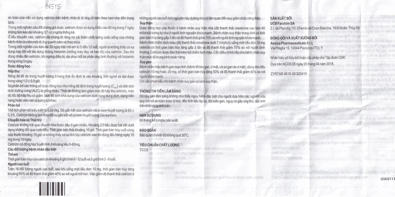 Nghiên cứu trên người tình nguyện khỏe mạnh cho thấy cetirizin liều 5mg và 10 mg ức chế mạnh phản ứng mày đay và ban đỏ do nồng độ rất cao của histamin trong da gây nên, nhưng mối tương quan với hiệu quả không được thiết lập. Sau khi uống liều đơn 10 mg, thuốc bắt đầu có tác dụng trong vòng 20 phút trên 50% đối tượng thử nghiệm và trong vòng 1 giờ trên 95% đối tượng. Tác dụng của thuốc duy trì ít nhất 24 giờ sau khi uống một liều đơn.